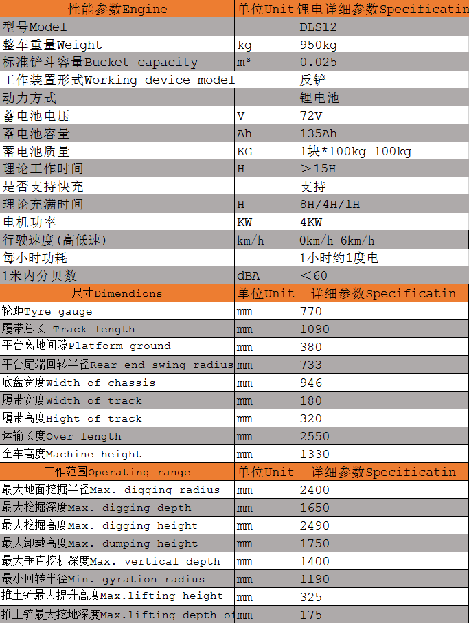 DLS12電動小型履帶挖掘機參數(shù)