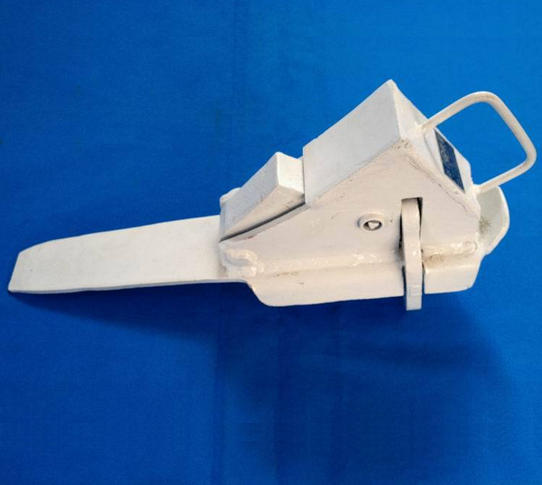 新型壓蓋式防盜鐵鞋結構上有了大變化,推動機構采用轉動壓蓋式。由壓蓋(3),銷軸(5),扭簧(11)及帶把撥勾。當車輪壓上鐵鞋,車輪轉動→壓上壓蓋→壓蓋轉動壓下撥勾把,使撥勾轉動,打開軌爪。保證鐵鞋通過鋼軌夾板,車輪退回,扭簧反彈推動壓蓋恢復原位。此鐵鞋軌爪打開阻力小,轉動靈活,十分可靠,一般不需要日常維修即可保證正常使用。十分適合現場工人使用。并能確保安全,可靠實用。
