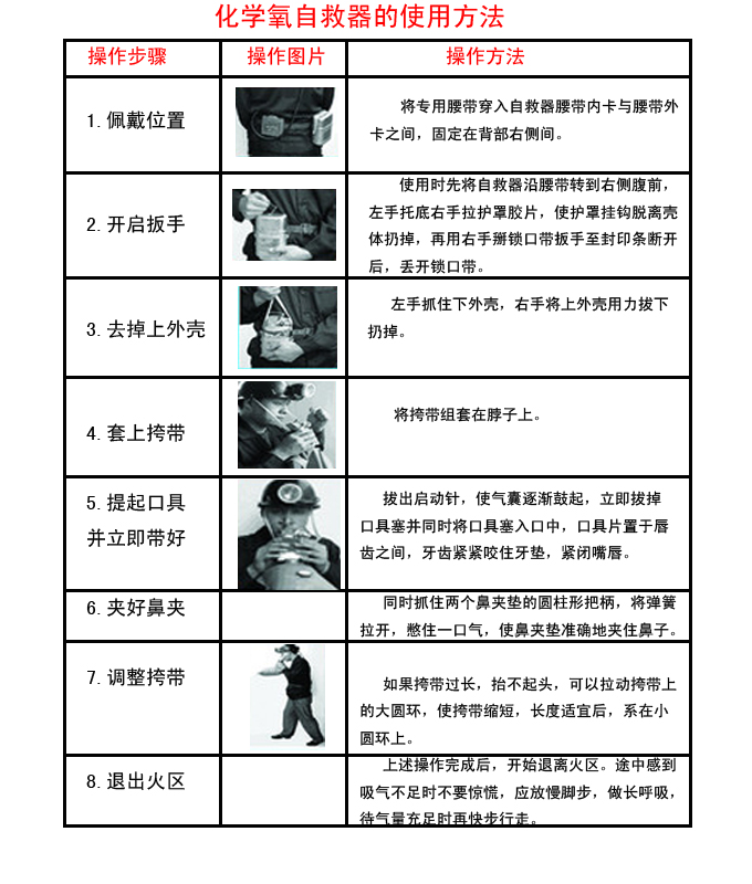 (1)使用范圍:1. 可供煤礦井下作業(yè)人員在發(fā)生瓦斯突出、火災(zāi)、爆炸等災(zāi)害性事故時,以及救護(hù)人員在呼吸器發(fā)生故障時迅速撤離災(zāi)區(qū)使用。如井下人員迂到巷道大面積冒頂,被堵人員可佩帶該自救器等待營救。