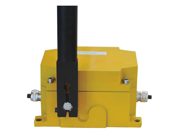 該產(chǎn)品按照一定間隔安裝在膠帶機(jī)的行人一側(cè),相鄰兩臺(tái)之間用鋼絲繩通過(guò)開(kāi)關(guān)上的擺臂連接起來(lái)。當(dāng)膠帶機(jī)發(fā)生緊急情況拉緊鋼絲繩時(shí),驅(qū)動(dòng)內(nèi)部凸輪,使行程開(kāi)關(guān)動(dòng)作并閉鎖,實(shí)現(xiàn)緊急停車同時(shí)發(fā)出報(bào)警信號(hào)。故障排除后,人工解鎖允許膠帶機(jī)運(yùn)行。